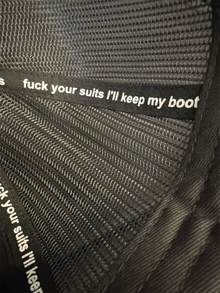 - "fuck your suits..." printed inner seam tape