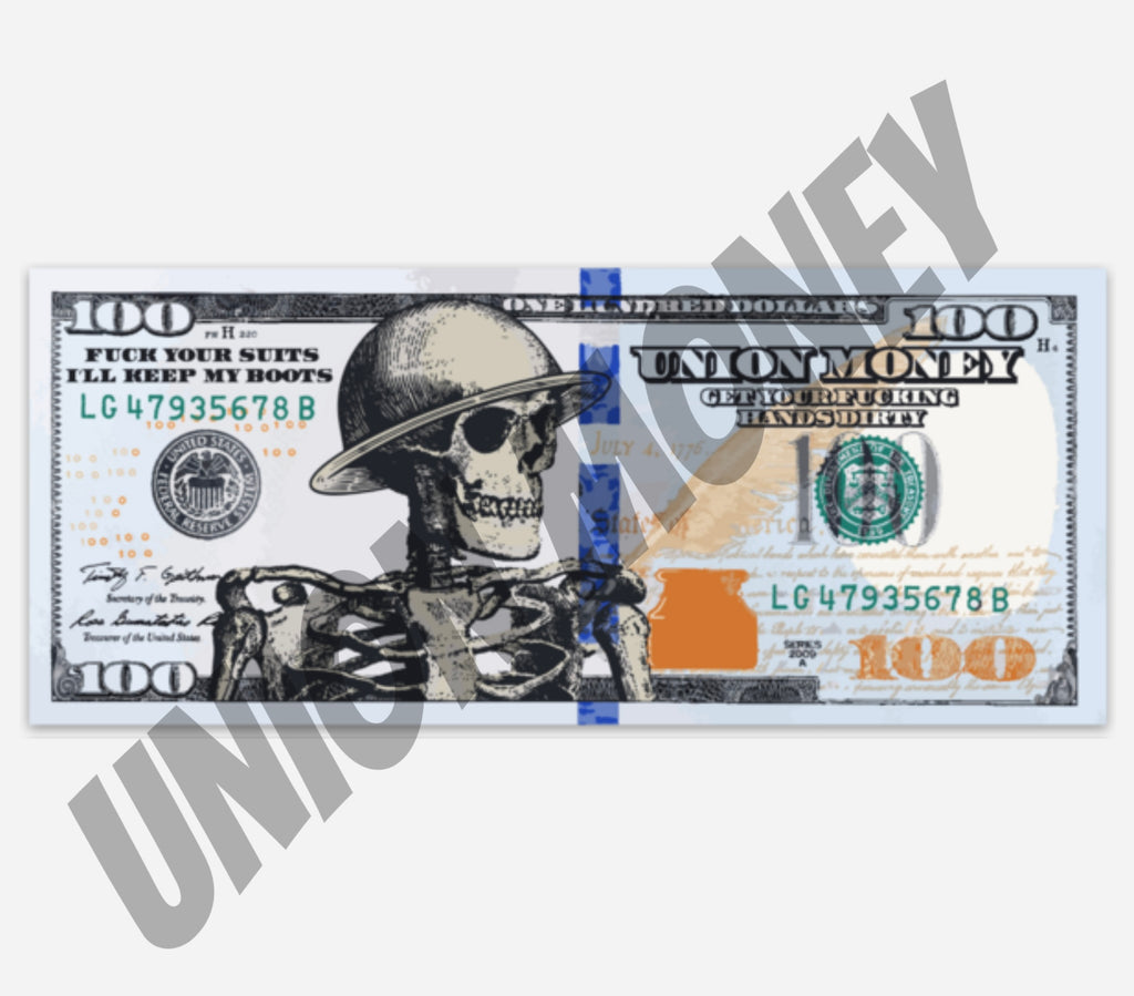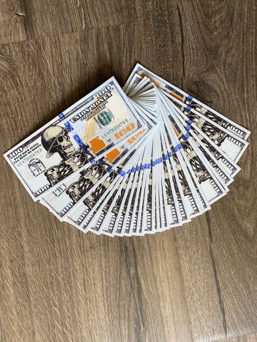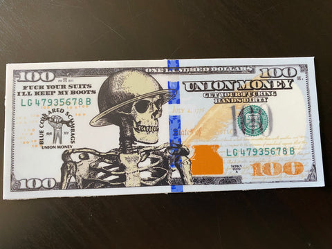 100 bill rectangle sticker. This bad boy measures “5.75 x 2.5” . Die cut sticker . Shits made to withstand all the shit we go through on the job site ! 12 -14 hours of Rain , snow lighting 24/7 365 , all that shit !!!