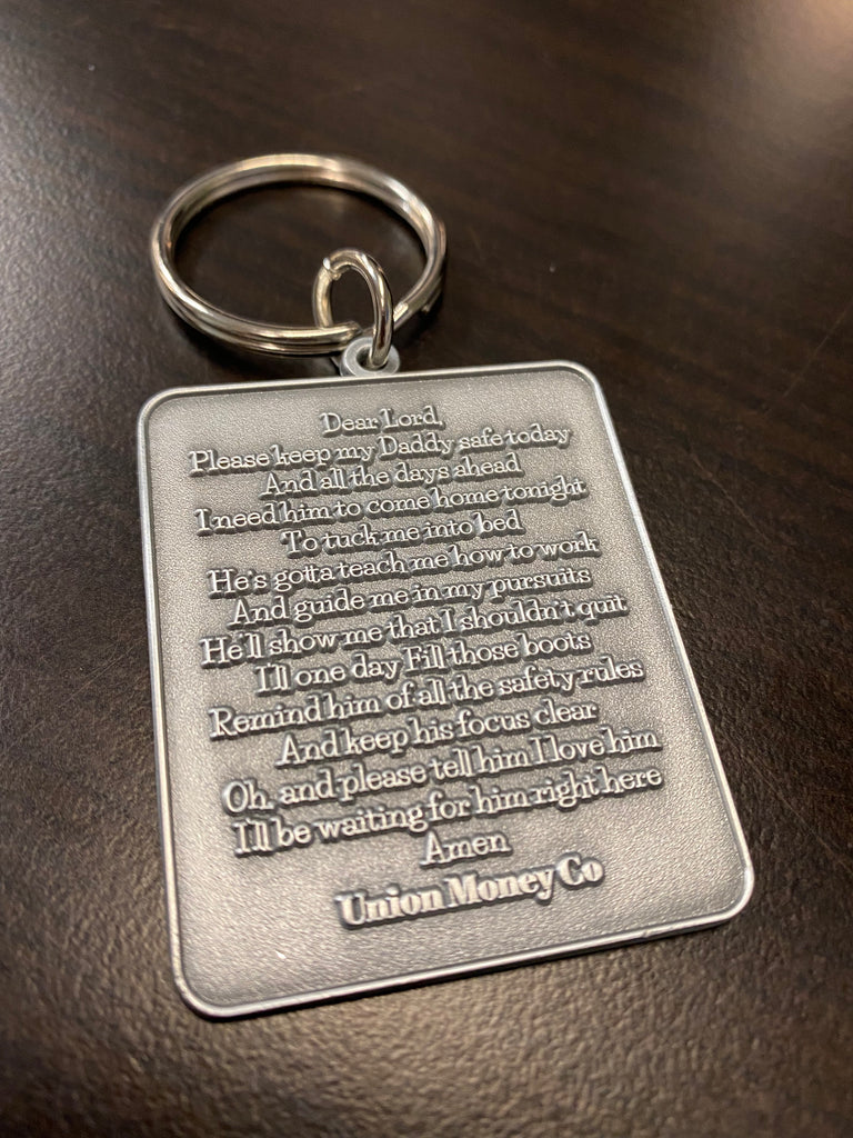 Bring a smile to your hard working union man with this sweet prayer keychain. Perfect for Father's Day, Birthday or just because. Give him a gift to remind him his kiddo is thinking of him with this Dye Struck Antique Silver Keychain. Daddy prayer on the front side and Last of a Dying Breed logo on the back.